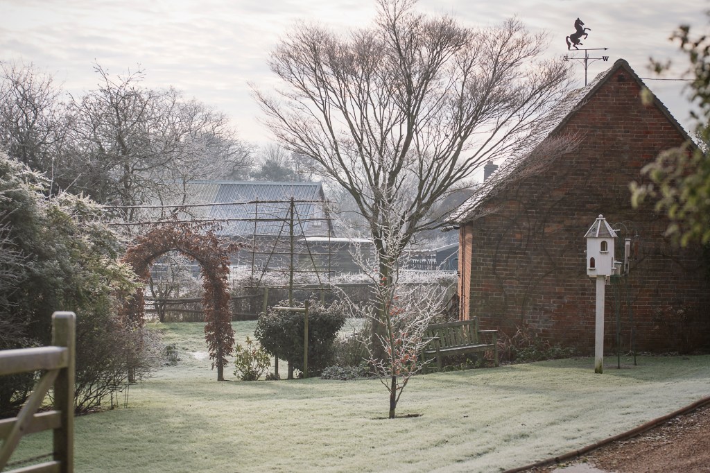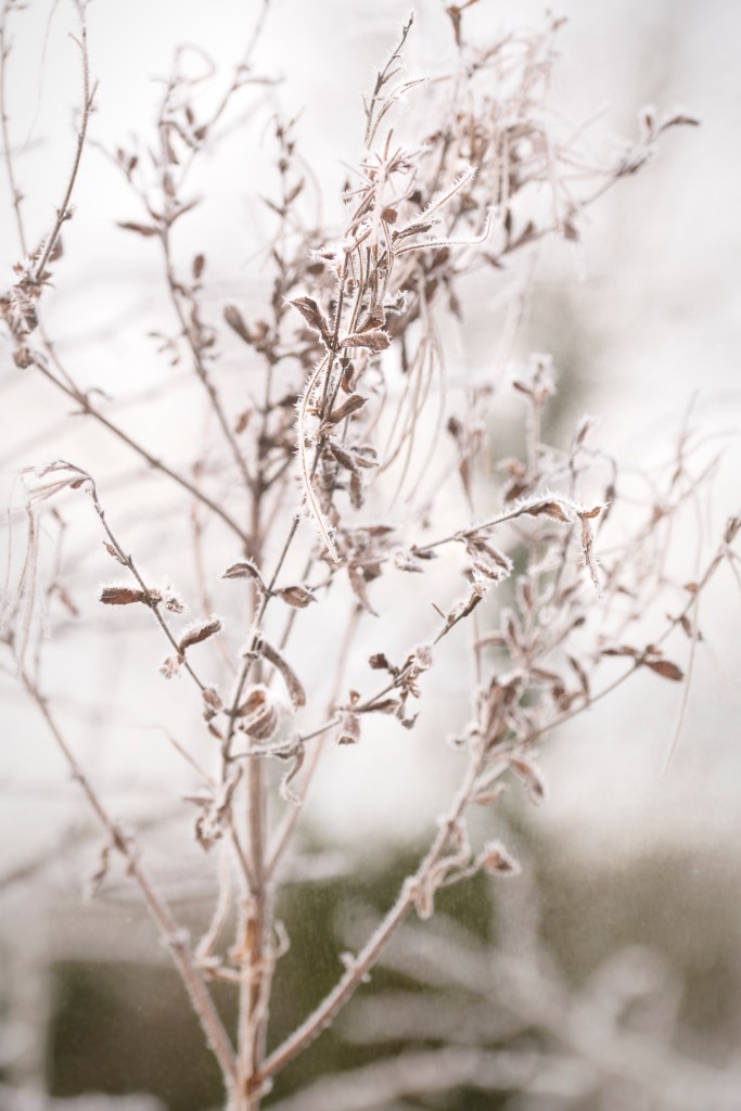 Late morning walk, by the frosty gardens of our hamlet, that offer nothing but the skeletal structures, the bare arms and twisted branches, the remnants of days long gone, calm and quiet nakedness, everything unveiled – holding strong, and keeping cool, still and without a move.